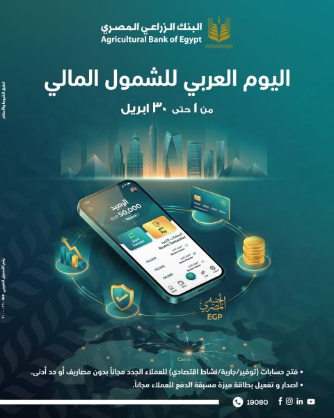 أعلن البنك الزراعي المصري إطلاق باقة من الخدمات المصرفية المجانية لعملائه، وذلك بمناسبة فعاليات اليوم العربي للشمول المالي، التي تُقام تحت رعاية البنك المركزي المصري خلال الفترة من 1 أبريل وحتى 30 أبريل 2026، في خطوة تستهدف تعزيز دمج المواطنين داخل القطاع المصرفي.