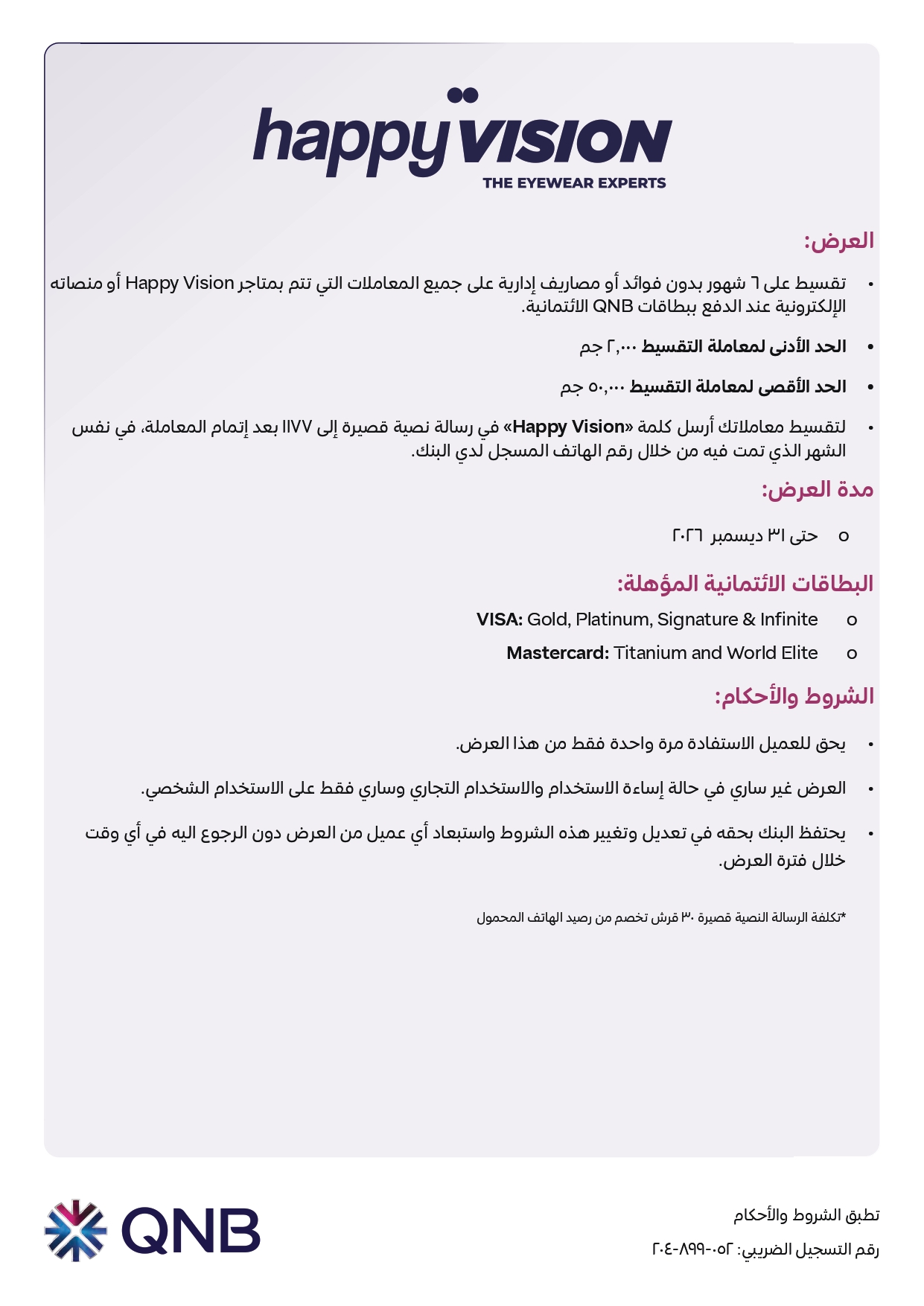 يوفر العرض للعملاء فرصة شراء أحدث النظارات الطبية والشمسية من فروع Happy Vision، مع إمكانية التقسيط على فترة تصل إلى 6 أشهر بدون فوائد، وذلك عند استخدام بطاقات QNB الائتمانية.