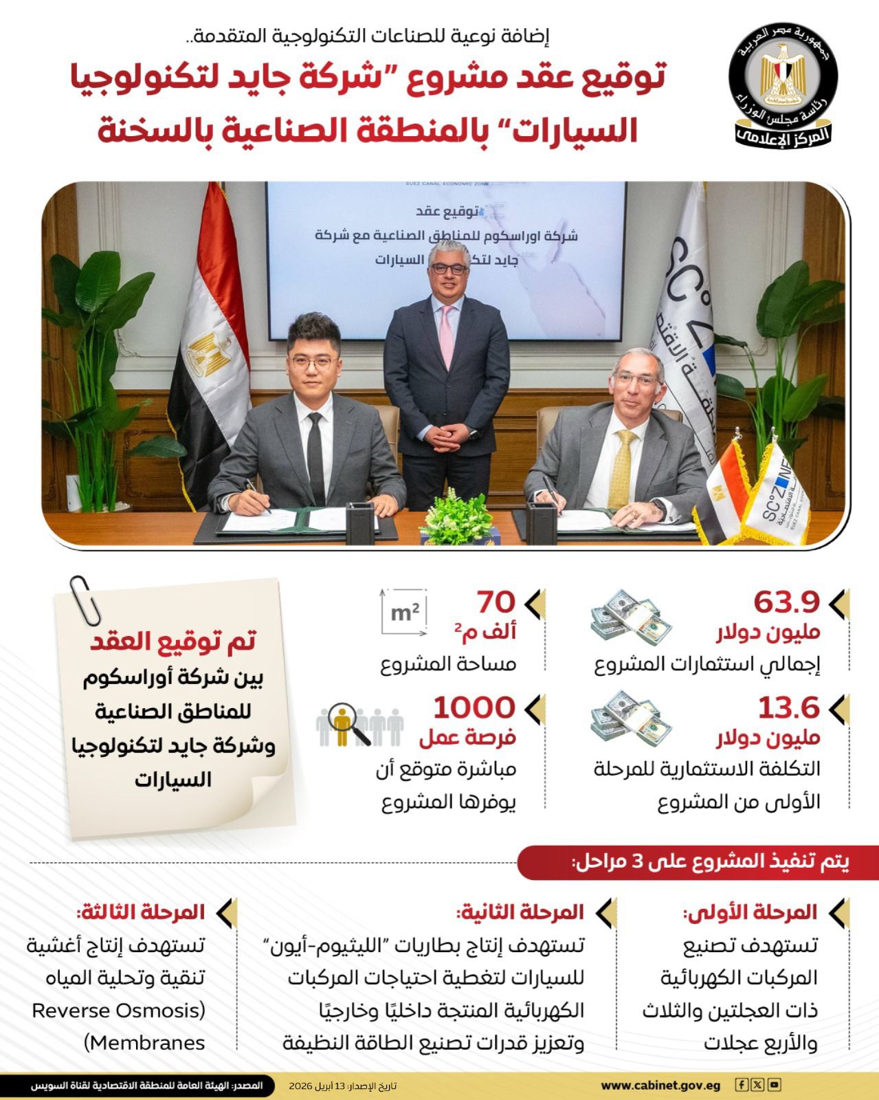 وأوضح مجلس الوزراء أن المشروع يهدف إلى تعزيز التحول نحو النقل النظيف والطاقة المستدامة، عبر إقامة مجمع صناعي متكامل داخل المنطقة الاقتصادية لقناة السويس.