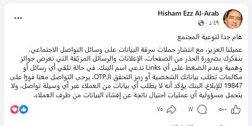 وشدد على ضرورة توخي الحذر عند تلقي رسائل أو مكالمات مشبوهة، مع أهمية التواصل الفوري مع البنك عبر الخط الساخن 19847 للإبلاغ عن أي محاولة احتيال.